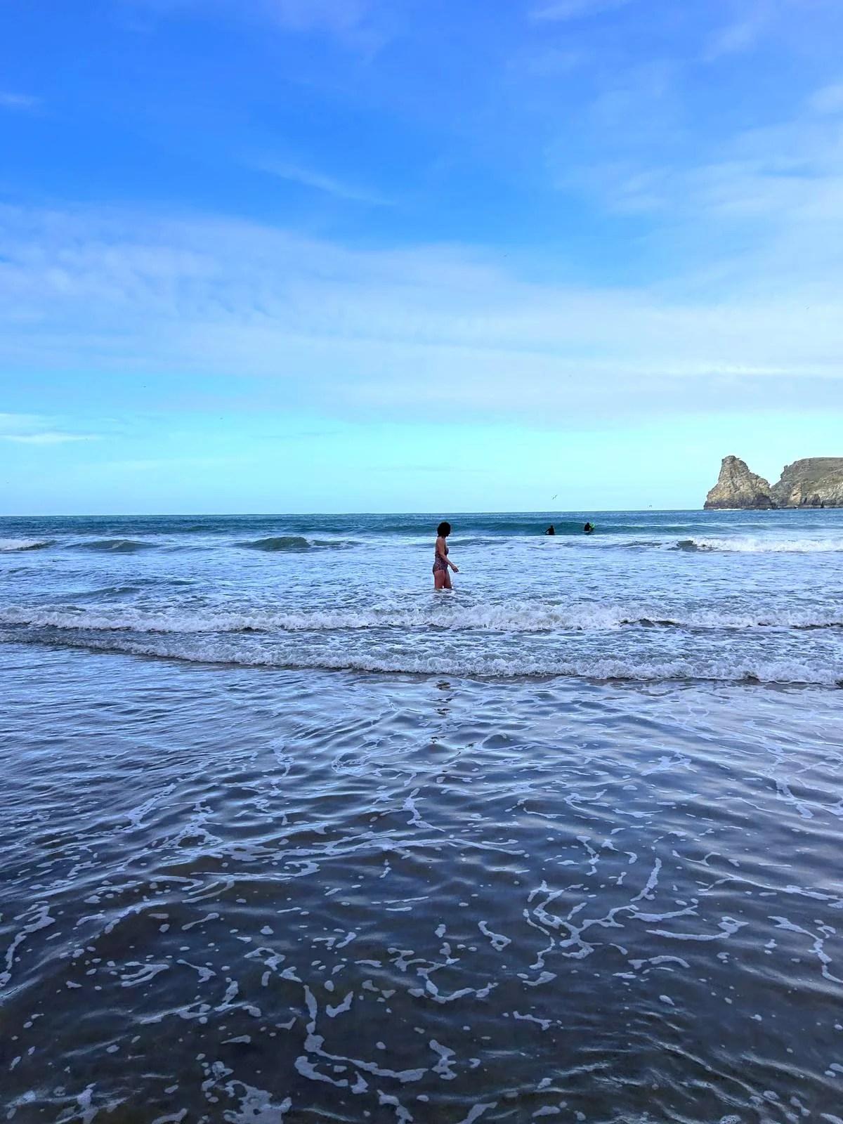 “Following a clifftop walk – cows on one side, turquoise sea on the other – we clambered down to the beach at Bossiney Haven where I joyously shed my winter clothes and ran into the freezing sea (and straight out again!) Afterwards I joined the group in a womb-like cave, we joined hands and raced across the soft sand, hooting with pleasure”